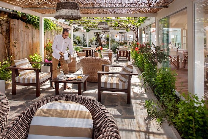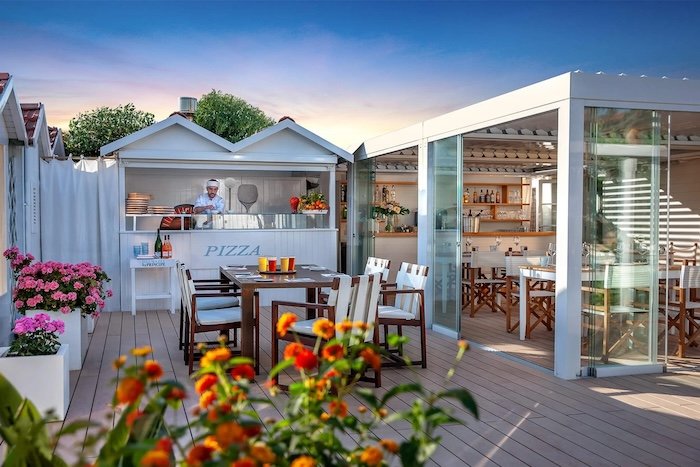 The aesthetic is minimalist and modern—light woods, soft linens, and perfectly spaced loungers that create a sense of privacy and calm. The beach restaurant serves fresh Mediterranean cuisine with a focus on seasonal seafood, paired with crisp wines and handcrafted cocktails ideal for long, leisurely afternoons.