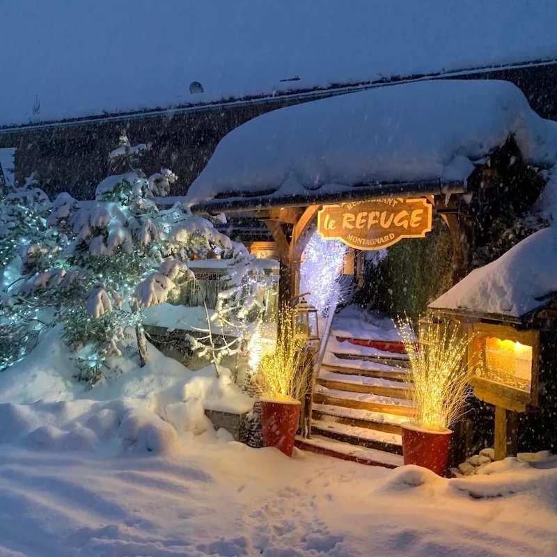 Le Refuge Megève offers a stylish all-day escape high above the village, combining restaurant, bar, and panoramic terrace into one seamless alpine destination. By day, it’s a sun-drenched lunch spot for skiers and strollers alike, serving generous sharing plates, fresh salads, and wood-fired pizzas with views across the peaks.