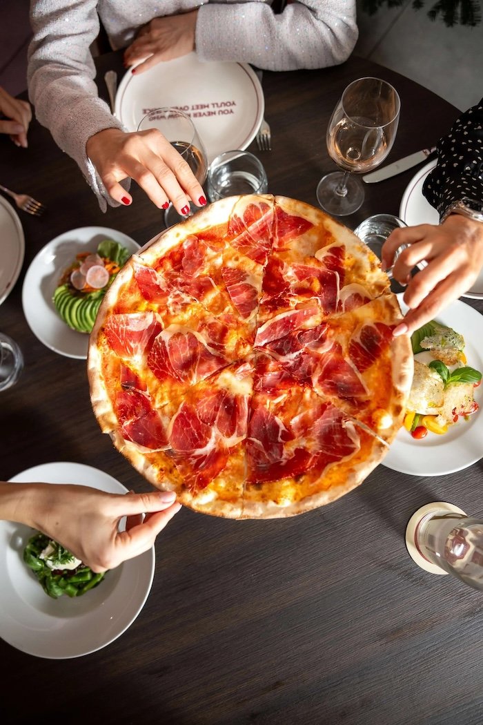 The menu focuses on ultra-thin, yeast-free dough made in-house and baked to crisp perfection. Toppings range from classic to decadent—think burrata, black truffle, and fine prosciutto—paired with vibrant salads, antipasti, and Italian cocktails served with flair. Expect fire, flair, and maybe even a pizza-spinning show.