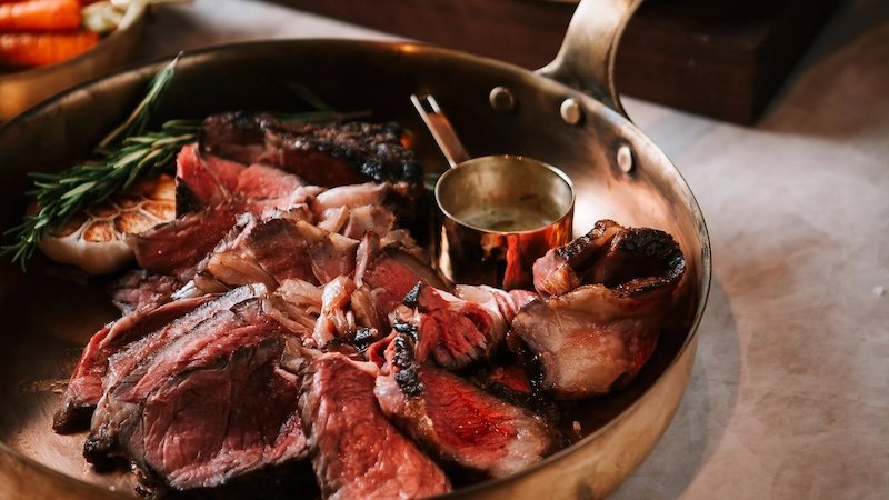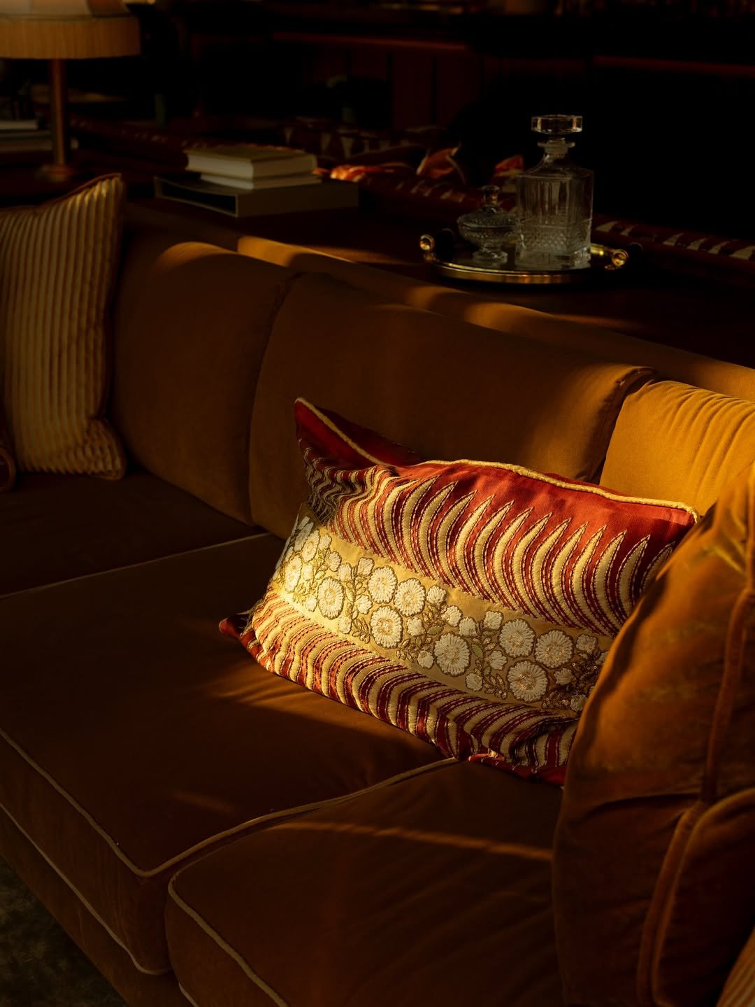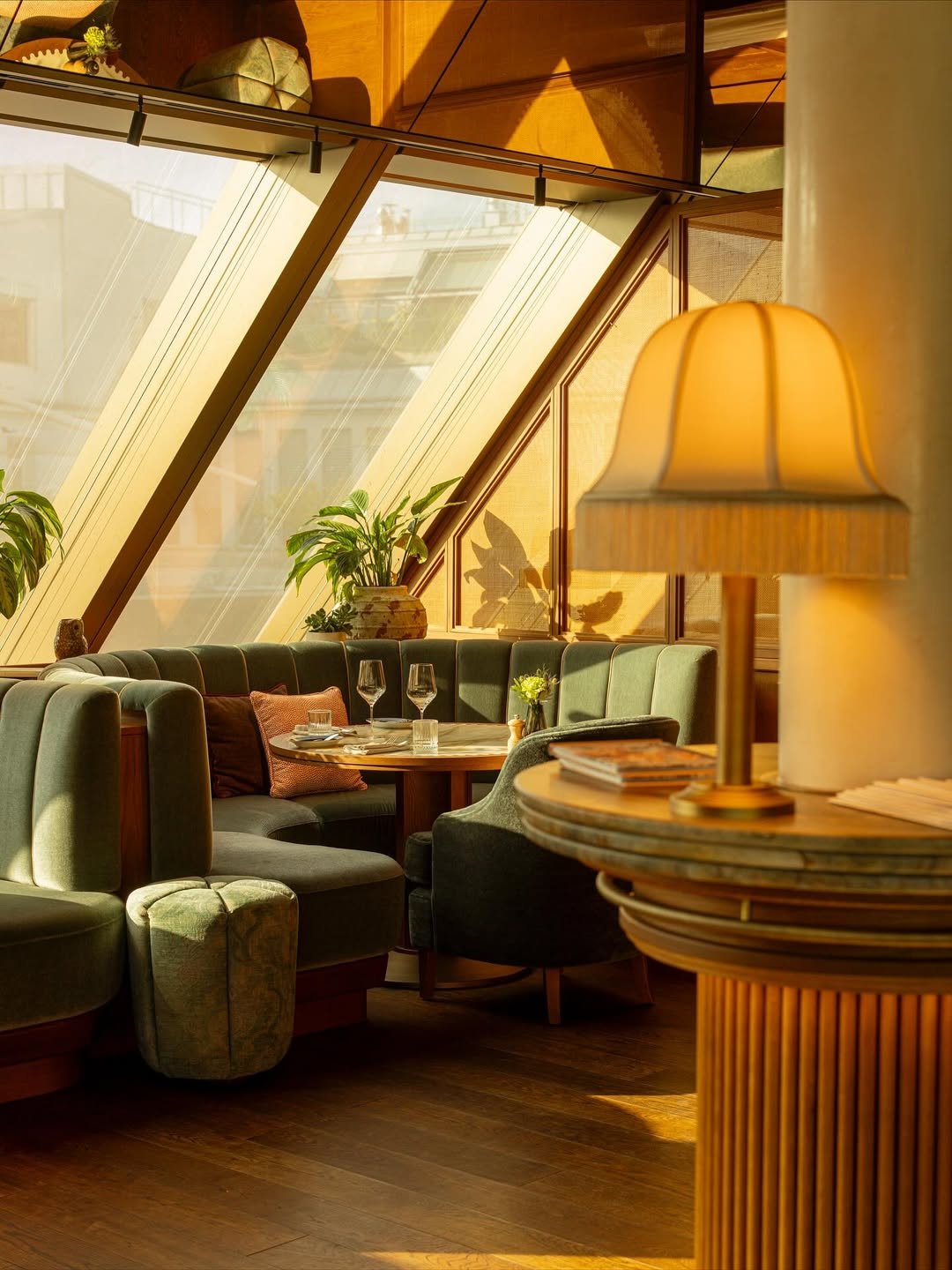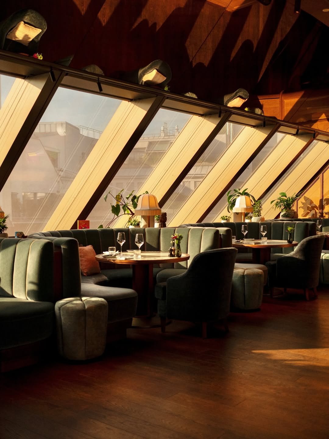 Interiors are moody and masculine—smoked glass, dark wood, and leather detailing—balanced by soft lighting and floor-to-ceiling windows. On warmer nights, the wraparound terrace becomes one of the city’s most coveted dinner spots.